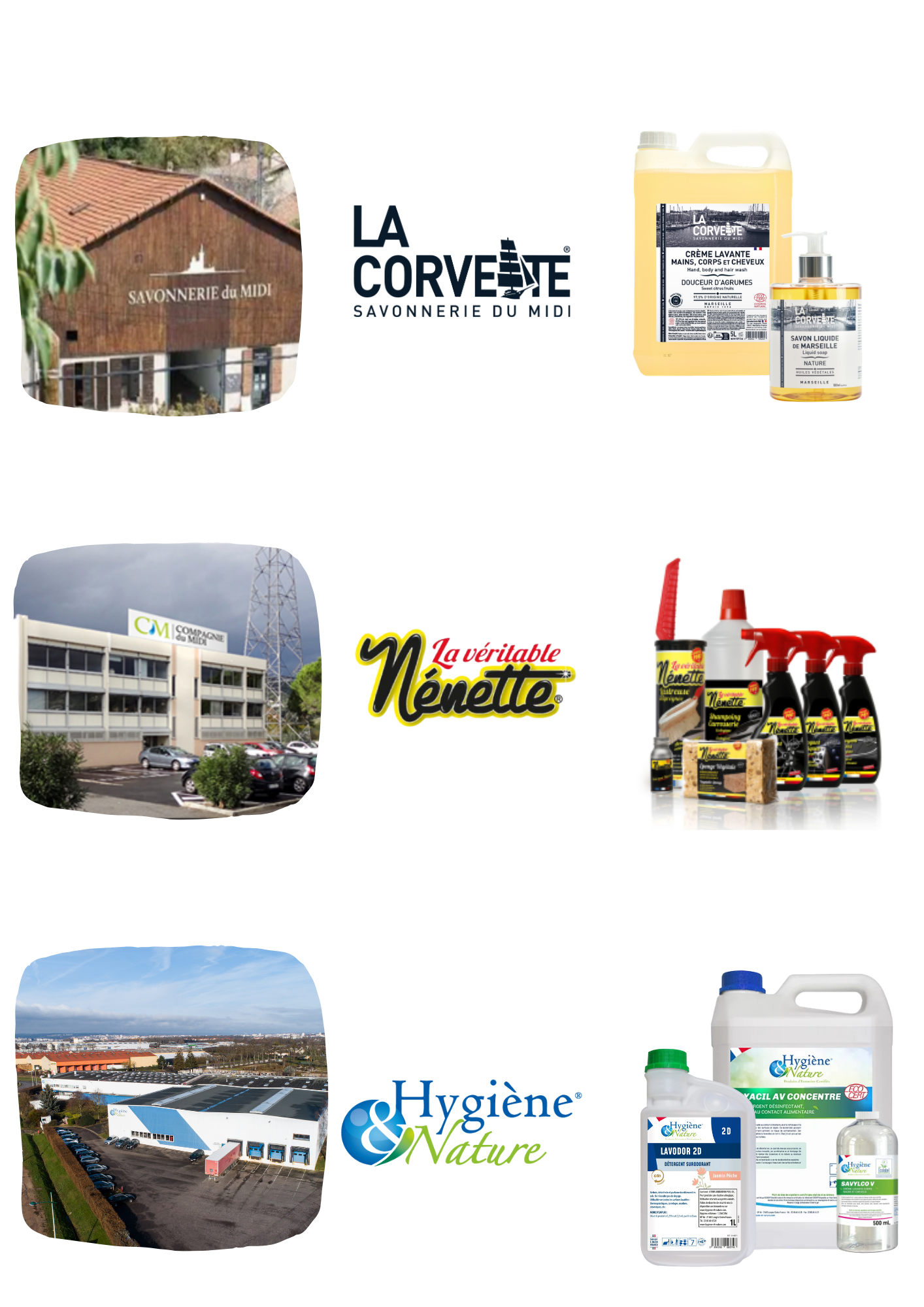 - Le véritable savon de Marseille, fabriqué par la Savonnerie du Midi, filiale de la Compagnie du Midi, basée à Marseille.