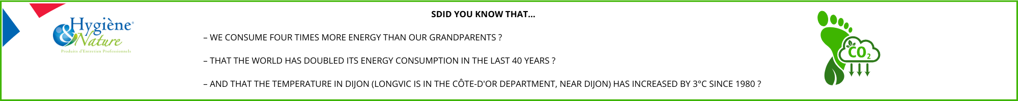 Hygiène et Nature already has a well-established CSR policy with certification LABEL PME+, an EcoVadis France silver medal and concrete actions that are part of this dynamic: Monitoring and reduction of energy consumption :